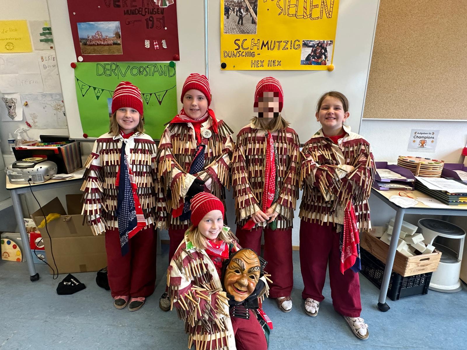 Kurz vor Fasnet durften die Kinder aus den Narrenvereinen ihr Häs vorstellen. Unter anderem bekamen wir die „Stecklesspringer“ aus Mundelfingen, einen „Burgbläri“ aus Gutmadingen, ein „Urviehch“ aus Bad Dürrheim, „Reetiwölfe“ aus Hausen und einen „Blindschießer“ aus Achdorf zu sehen. Die Kinder durften Wolfsmilch trinken, wurden mit Gutzle verwöhnt und auch der Tanz der Stecklesspringer mit originaler Musik hat uns allen sehr gefallen. Vielen Dank an alle beteiligten Eltern und Kinder, die diese närrischen Tage somit noch toller gemacht haben.